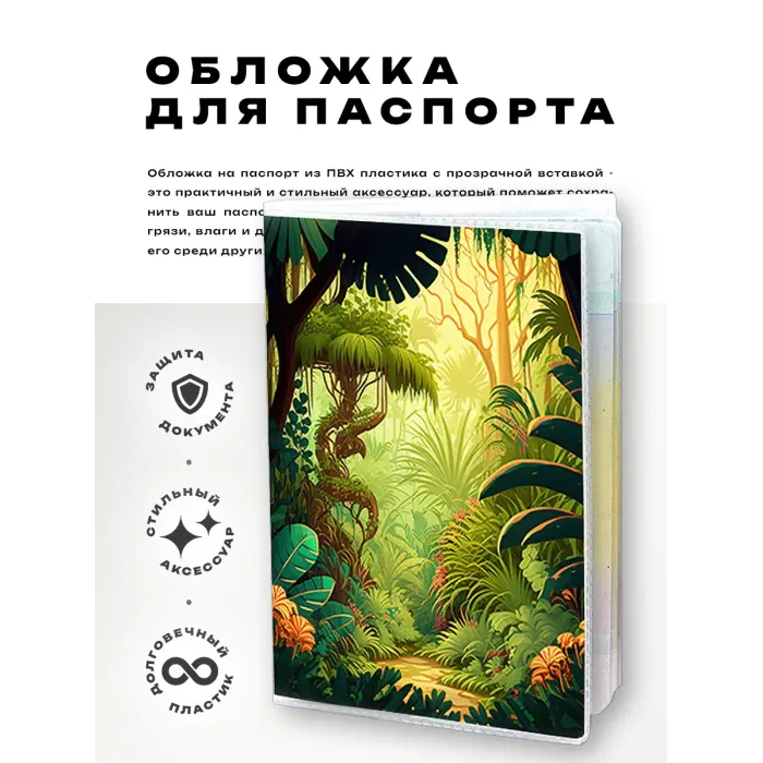 Обложка для паспорта из прозрачного ПВХ пластика — это стильный и практичный аксессуар, который не только защищает документ, но и придаёт ему оригинальный вид. Полиграфическая вставка с ярким дизайном в стиле джунглей добавляет индивидуальности. Упаковка выполнена в удобном полипропиленовом пакете с вырубкой под еврокрючок, что делает её идеальной для подарка или продажи в магазине. Обложка сочетает в себе качество и уникальный стиль, что делает её отличным выбором для путешественников и любителей приключений.
