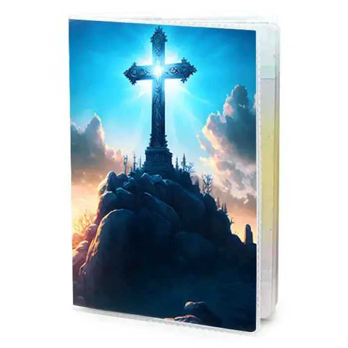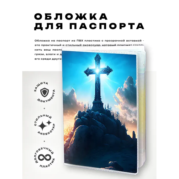 Обложка для паспорта — это не только практичный аксессуар, но и символ веры. Изготовленная из прозрачного ПВХ пластика, она надежно защитит паспорт от повреждений и загрязнений. Полиграфическая вставка с изображением Поклонного креста на горе добавляет изделию уникальности и глубины. Упаковка в полипропиленовый пакет с вырубкой под еврокрючок делает ее идеальным вариантом для подарка или личного использования. Обложка станет стильным дополнением к любому путешествию.