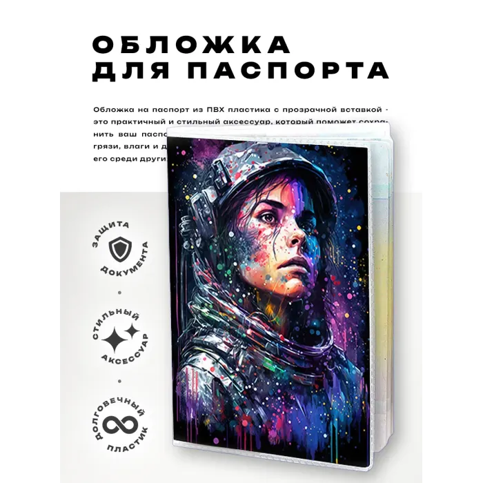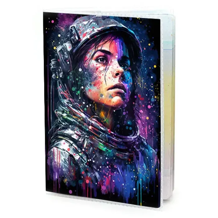 Обложка для паспорта из прозрачного ПВХ пластика с полиграфической вставкой с изображением женщины-космонавта.