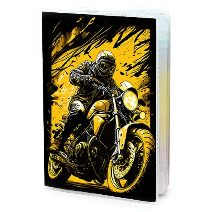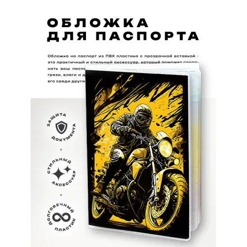 Обложка для паспорта из прозрачного ПВХ пластика с полиграфической вставкой с изображением мотоциклиста.