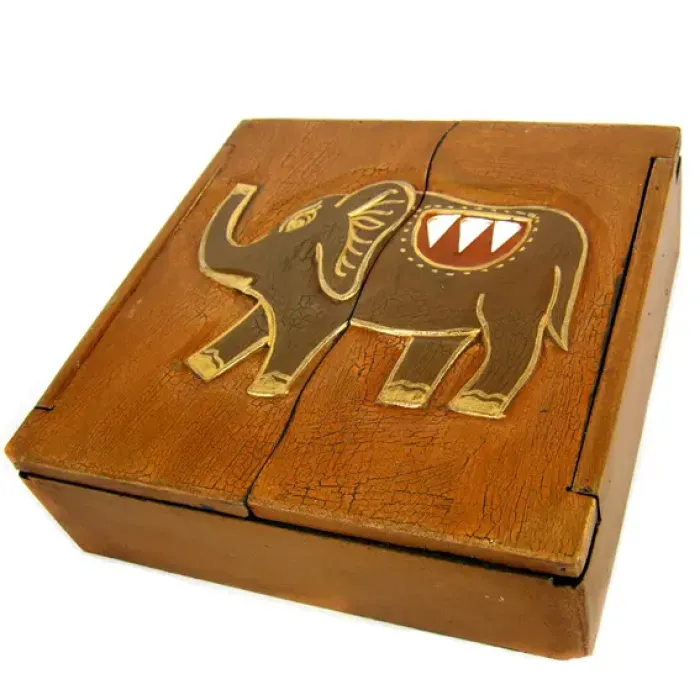 Двустворчатая деревянная шкатулка для хранения с изображением слона.