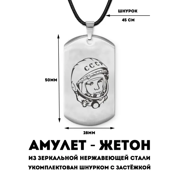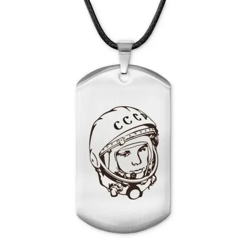 Амулет-жетон с изображением Гагарина. Изготовлен из нержавеющей стали с лазерной гравировкой.