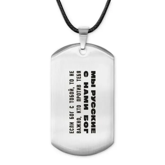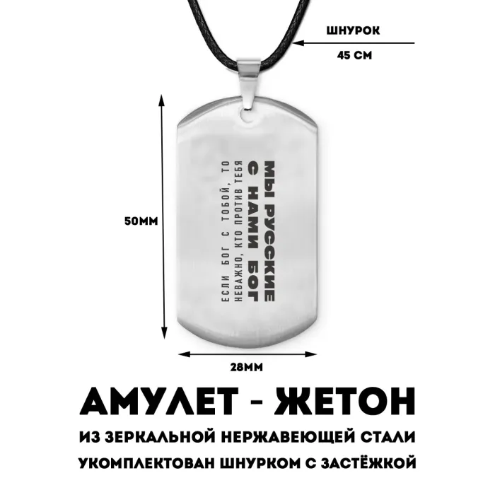 Амулет-жетон с патриотической надписью, выполненный из полированной нержавеющей стали с лазерной гравировкой.