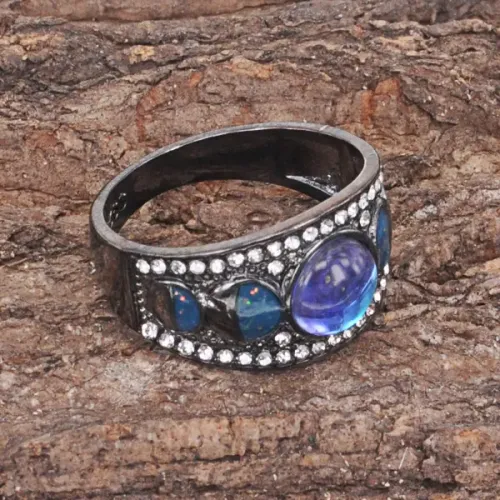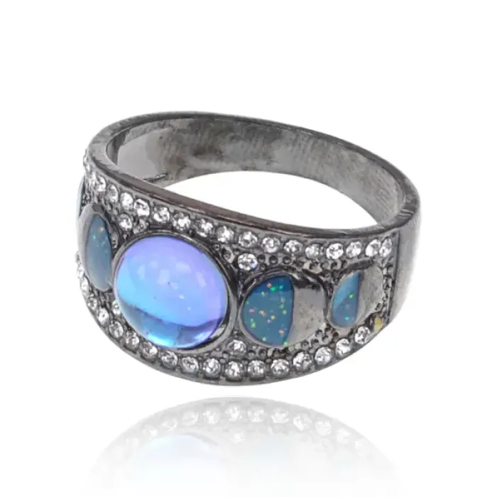 Кольцо с лунным камнем. Металлическое кольцо с элементами в виде фаз луны, украшенное стразами и синтетическим лунным камнем.