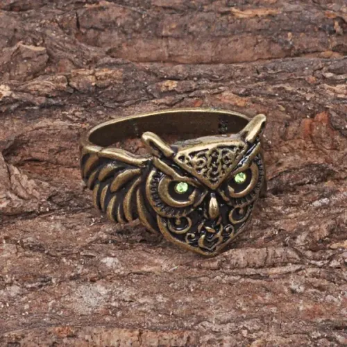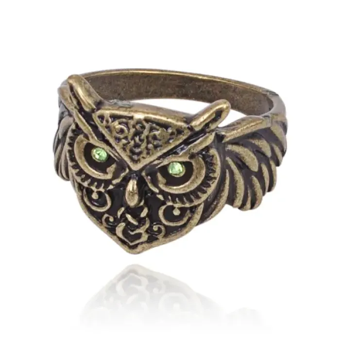 Кольцо с изображением совы. Изготовлено из металла с покрытием под бронзу, украшено стразами.
