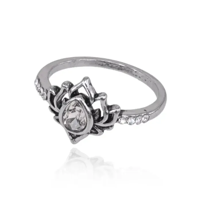 Кольцо с дизайном в виде лотоса. Материал — металл с покрытием под серебро, украшен кристаллами и стразами.