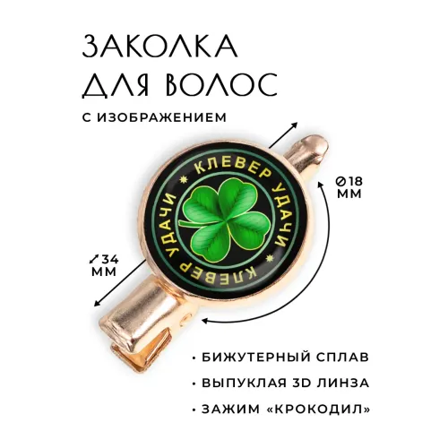 Размеры и комплектация: Размер заколки: 34х20х15 мм, диаметр изображения: 18 мм. Тип зажима: крокодил. Упаковка: прозрачный пакет.