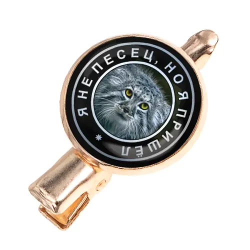 Заколка для волос из бижутерного сплава с покрытием под розовое золото и изображением манула под стеклянной линзой.