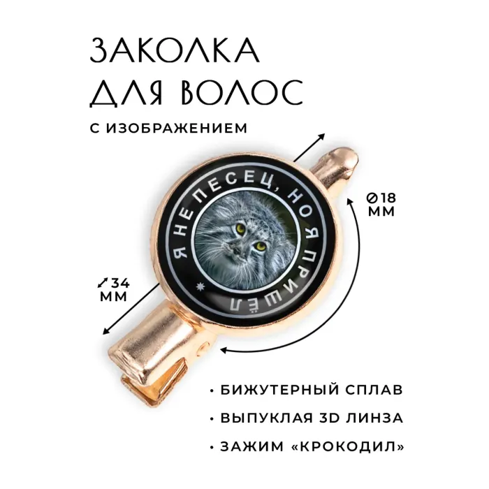 Размеры и комплектация: Размер заколки: 34х20х15 мм, диаметр изображения: 18 мм. Тип зажима: крокодил. Упаковка: прозрачный пакет.