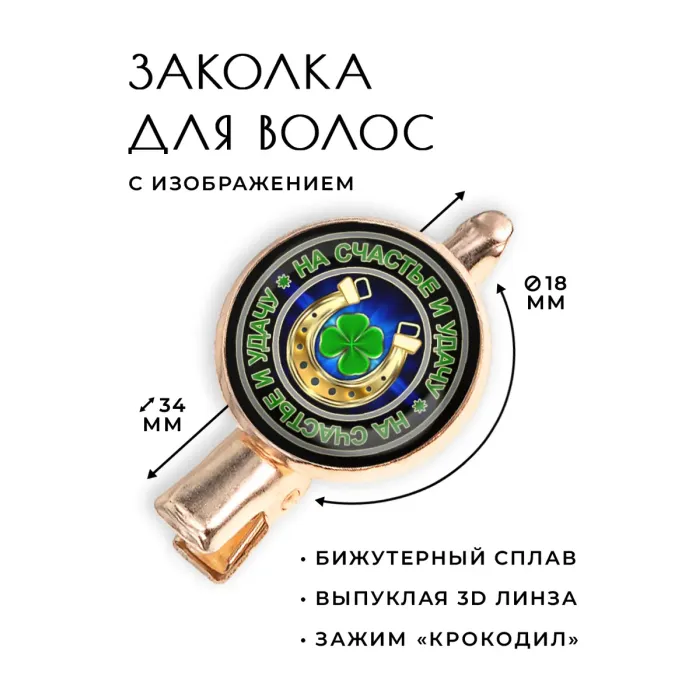 Размеры и комплектация: Размер заколки: 34х20х15 мм. Диаметр изображения: 18 мм. Упаковка: прозрачный пакет.