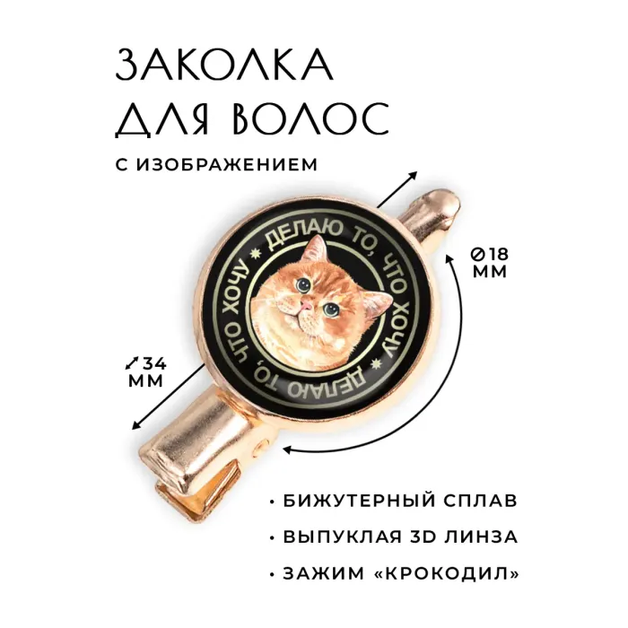 Размеры и комплектация: Размер заколки 34х20х15 мм, диаметр изображения 18 мм. Упаковка — прозрачный пакет.