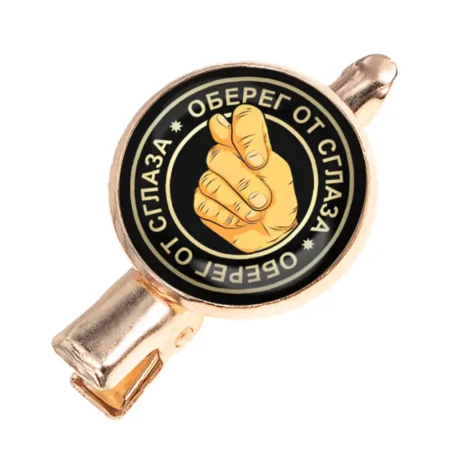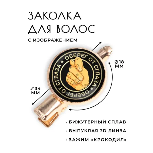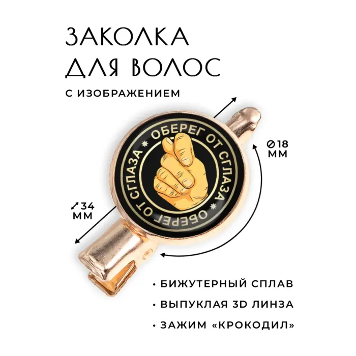 Заколка-оберег от сглаза из бижутерного сплава с покрытием под розовое золото и изображением под выпуклой стеклянной линзой.