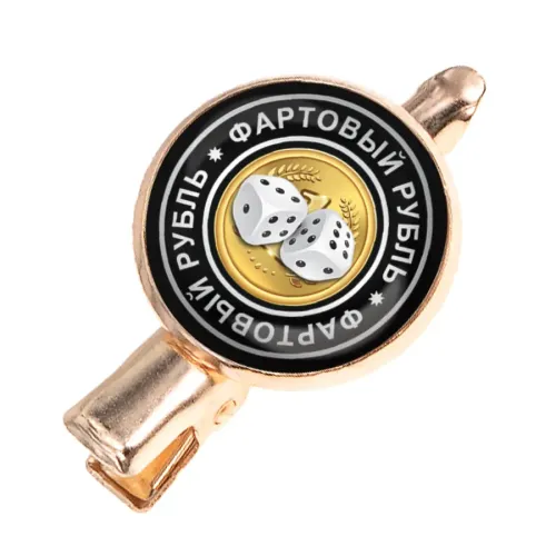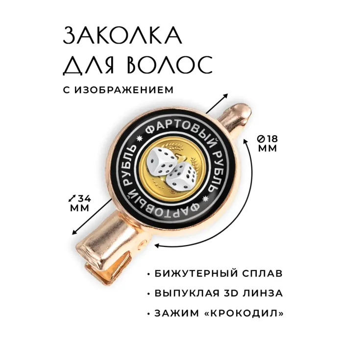 Заколка для волос «Фартовый рубль» из бижутерного сплава с покрытием под розовое золото и декоративным элементом под стеклянной линзой.
