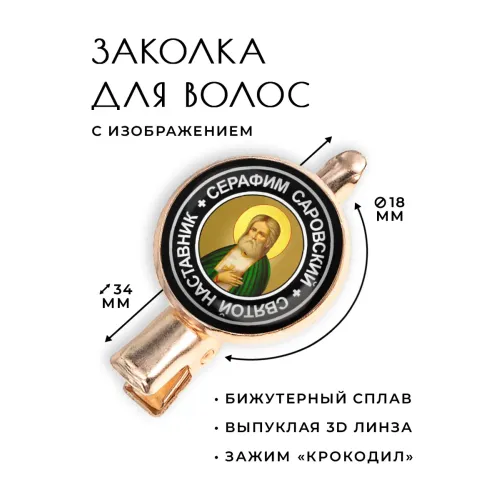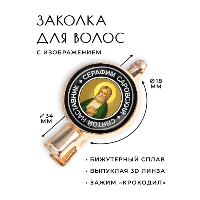 Заколка, посвященная Святому Преподобному Серафиму Саровскому, символизирует духовную силу и надежду. Изготовлена из бижутерного сплава с покрытием под розовое золото, она станет стильным акцентом в любом образе. Основные характеристики: