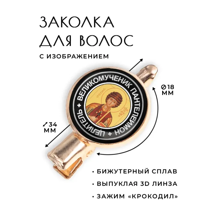 Заколка с изображением Святого великомученика и целителя Пантелеимона — это не только стильный аксессуар, но и символ защиты и благополучия. Изготовленная из бижутерного сплава с покрытием под розовое золото, она привносит нотку элегантности в любой образ.