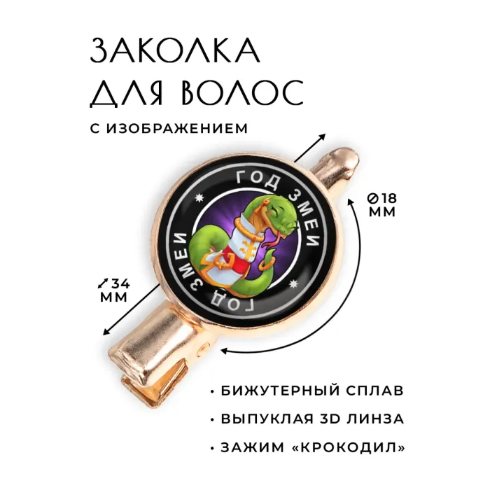 Заколка Восточный гороскоп - год Змеи является стильным аксессуаром, который сочетает в себе красоту и символику восточного зодиака. Этот изысканный элемент украшен изображением змеи, защищенным выпуклой стеклянной линзой, что придаёт ему особую привлекательность.