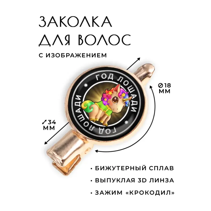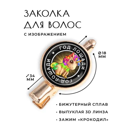 Заколка Восточный гороскоп - год Лошади станет стильным аксессуаром для любителей астрологии и символики. Она выполнена из бижутерного сплава с элегантным покрытием под розовое золото, что придаёт изделию особый шарм. Основные характеристики включают тип зажима крокодил, который обеспечивает надежную фиксацию. Размер заколки составляет 34х20х15 см, а диаметр изображения – 18 мм. Изображение защищено выпуклой стеклянной линзой, что добавляет долговечности и яркости деталям. Товар упакован в прозрачный пакет, что делает его отличным вариантом для подарка или личного использования.