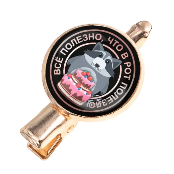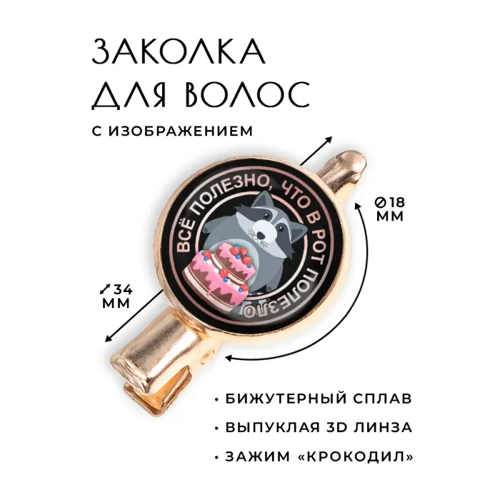 Размеры и комплектация: Размер заколки: 34х20х15 см, диаметр изображения: 18 мм. Упаковка: прозрачный пакет.