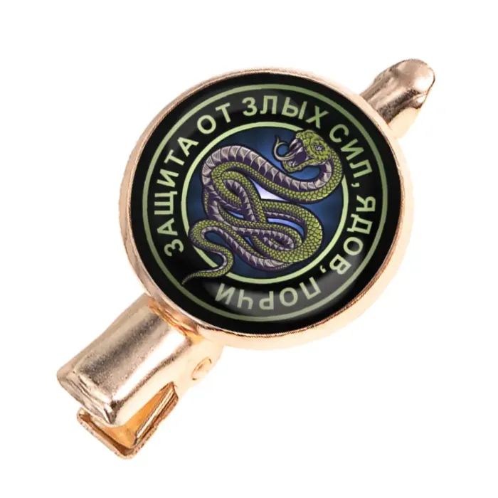 Заколка для волос в виде змеи из бижутерного сплава с покрытием под розовое золото и декоративным элементом под стеклянной линзой.