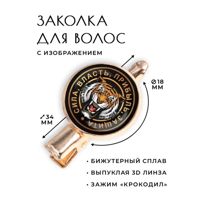 Заколка для волос с изображением тигра. Изготовлена из бижутерного сплава с покрытием под розовое золото, оснащена зажимом типа «крокодил».