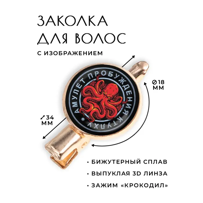 Заколка-аксессуар «Амулет пробуждения Ктулху» из бижутерного сплава с покрытием под розовое золото и изображением под выпуклой стеклянной линзой.
