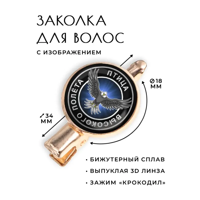 Заколка "Птица высокого полёта" — это стильный аксессуар, который добавит изюминку в любой образ. Изготовленная из бижутерного сплава с покрытием под розовое золото, она сочетает в себе элегантность и современный дизайн. Основные характеристики: тип зажима — крокодил, размеры заколки составляют 34х20х15 см, а диаметр изображения — 18 мм. Изображение защищено выпуклой стеклянной линзой, что придаёт дополнительную защиту и блеск. Упакована в прозрачный пакет для удобства хранения или подарка. Этот аксессуар станет отличным дополнением как для повседневного использования, так и для особых случаев.