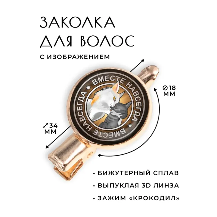 Заколка "Вместе навсегда" — это стильный аксессуар, который станет прекрасным дополнением к любому образу. Изготовленная из бижутерного сплава с покрытием под розовое золото, она привлекает внимание своим элегантным дизайном и блеском.