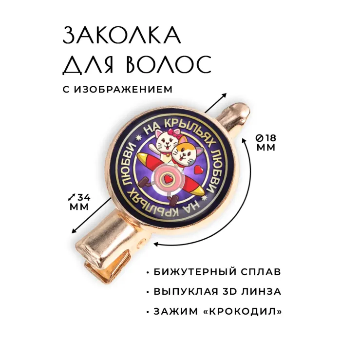 Заколка "На крыльях любви" — это стильный аксессуар, который добавит изысканности любому образу. Изготовленная из бижутерного сплава с покрытием под розовое золото, она сочетает в себе элегантность и прочность. Тип зажима — крокодил, что обеспечивает надежное крепление на волосах. Размер заколки составляет 34х20х15 см, а диаметр изображения — 18 мм. Изображение защищено выпуклой стеклянной линзой, что придаёт ему яркость и глубину. Товар упакован в прозрачный пакет, что делает его отличным вариантом для подарка или личного использования.