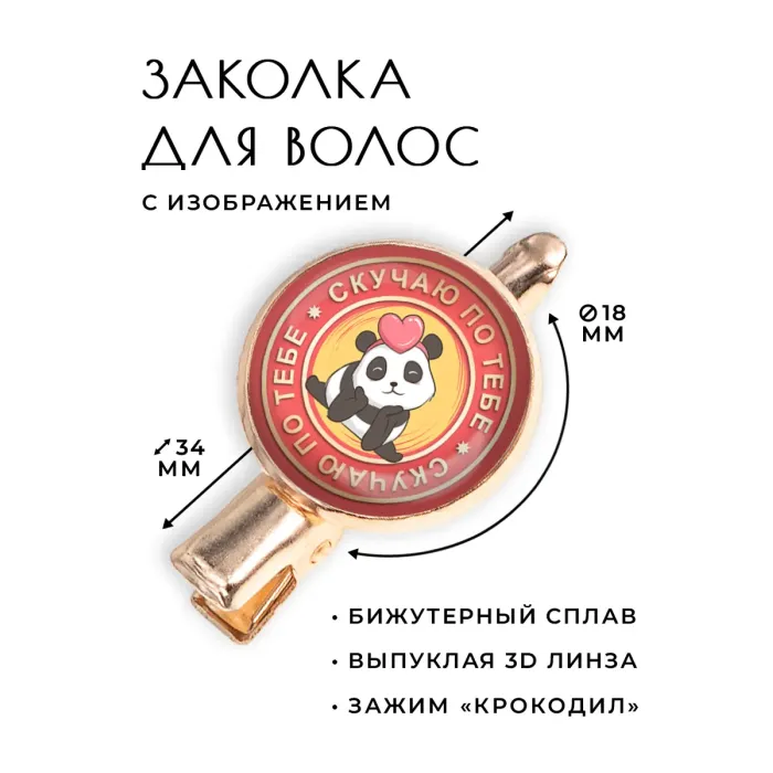 Элегантная заколка "Скучаю по тебе" выполнена из бижутерного сплава с покрытием под розовое золото, что придаёт ей утончённый вид. Эта заколка имеет тип зажима крокодил, обеспечивая надежное крепление волос. Размеры заколки составляют 34х20х15 см, а диаметр изображения — 18 мм. Изображение защищено выпуклой стеклянной линзой, что делает его ярким и долговечным. Товар упакован в прозрачный пакет, что позволяет сохранить его в идеальном состоянии до момента использования.