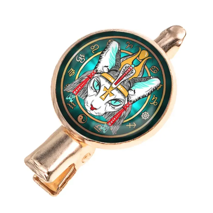 Заколка для волос в виде египетской кошки из бижутерного сплава с покрытием под розовое золото и стеклянной линзой.