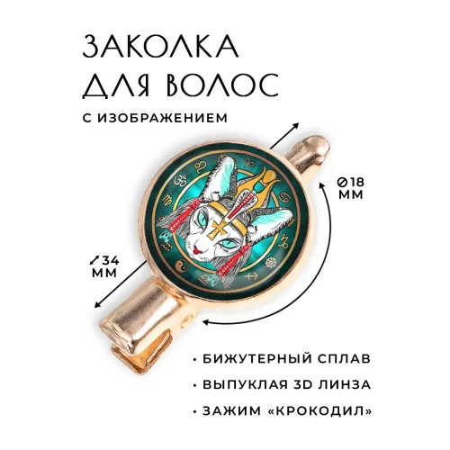 Размеры и комплектация: Размер заколки 34х20х15 мм, диаметр изображения 18 мм. Тип зажима — крокодил. Упаковка — прозрачный пакет.