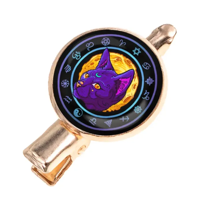 Заколка для волос «Лунный кот» из бижутерного сплава с покрытием под розовое золото и защитным стеклянным элементом.