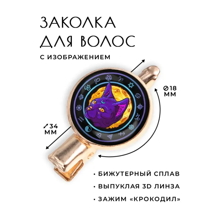Размеры и комплектация: Размер заколки 34х20х15 мм, диаметр изображения 18 мм. Упаковка — прозрачный пакет.