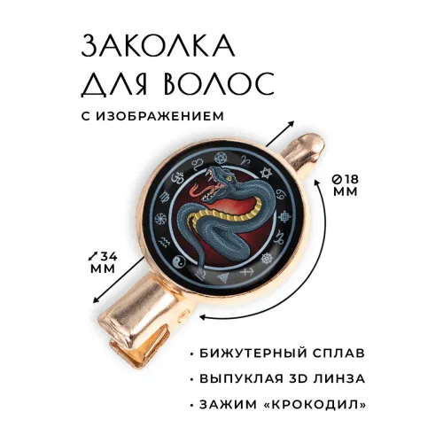 Размеры и комплектация: Размер заколки: 34х20х15 мм. Диаметр изображения: 18 мм. Тип зажима: крокодил. Упаковка: прозрачный пакет.