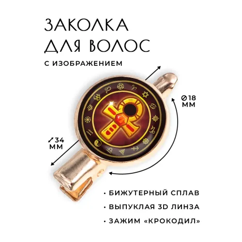Размеры и комплектация: Размеры заколки: 34х20х15 мм, диаметр изображения: 18 мм. Тип зажима: крокодил. Упаковка: прозрачный пакет.
