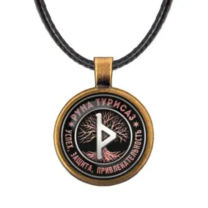 Кулон из бижутерного сплава с изображением руны Турисаз под выпуклой стеклянной линзой.