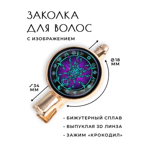 Размеры и комплектация: Размер заколки: 34х20х15 мм, диаметр изображения: 18 мм. Тип зажима: крокодил. Упаковка: прозрачный пакет.