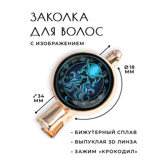 Заколка для волос в виде Ктулху из бижутерного сплава с покрытием под розовое золото и стеклянной линзой.