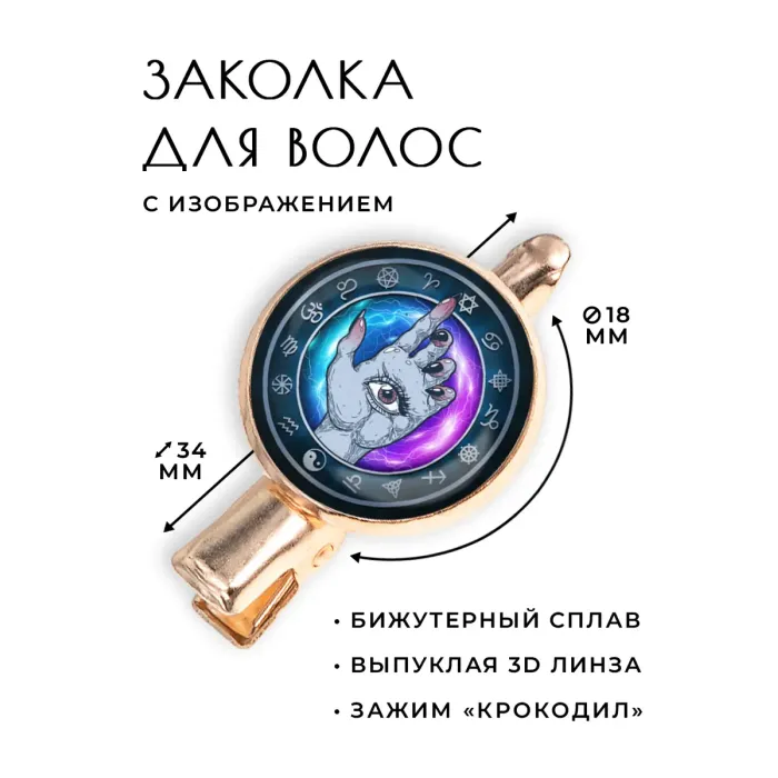Размеры и комплектация: Размер заколки: 34х20х15 мм. Диаметр изображения глаза: 18 мм. Тип зажима: крокодил. Упаковка: прозрачный пакет.