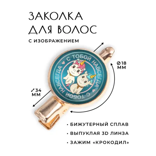 Заколка «С тобой навсегда» — это изысканный аксессуар, который добавит шарма и элегантности любому образу. Изготовленная из бижутерного сплава с покрытием под розовое золото, она сочетает в себе стиль и прочность. Тип зажима — крокодил, что обеспечивает надежную фиксацию волос. Размер заколки составляет 34х20х15 см, а диаметр изображения — 18 мм, защищенного выпуклой стеклянной линзой. Упакована в прозрачный пакет для удобства хранения и подарков.