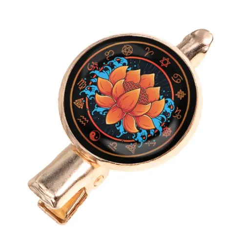 Заколка для волос в виде лотоса из бижутерного сплава с покрытием под розовое золото и стеклянной линзой.