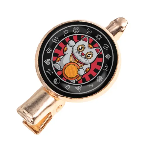 Заколка для волос с изображением Манеки-Неко. Изготовлена из бижутерного сплава с покрытием под розовое золото, тип зажима — крокодил.