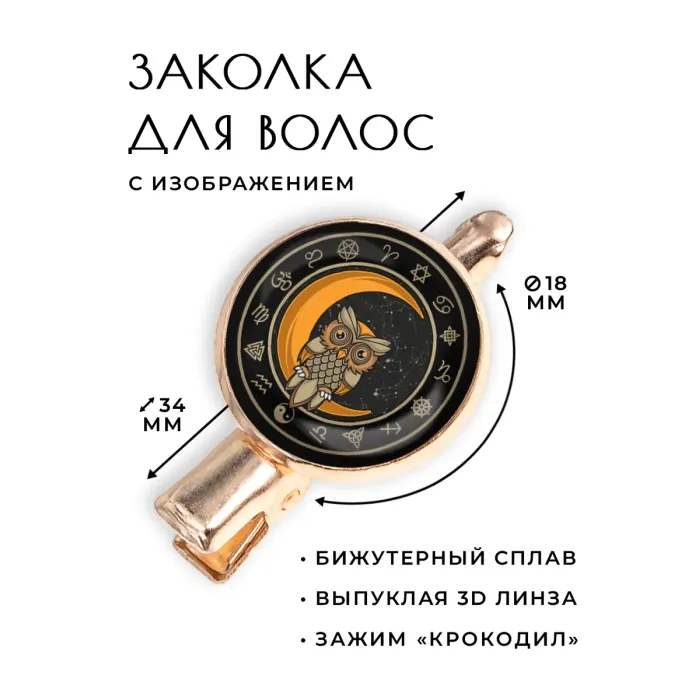 Размеры и комплектация: Размер заколки 34х20х15 мм, диаметр изображения 18 мм. Тип зажима — крокодил. Упаковка — прозрачный пакет.