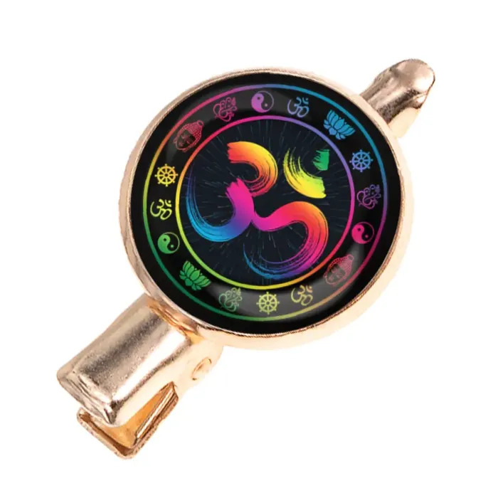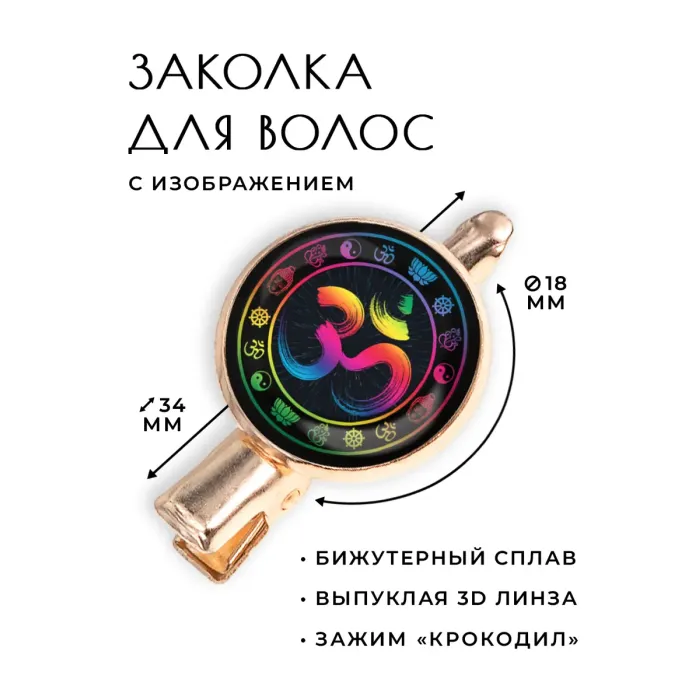 Заколка для волос из бижутерного сплава с покрытием под розовое золото и декором в виде символа Ом.