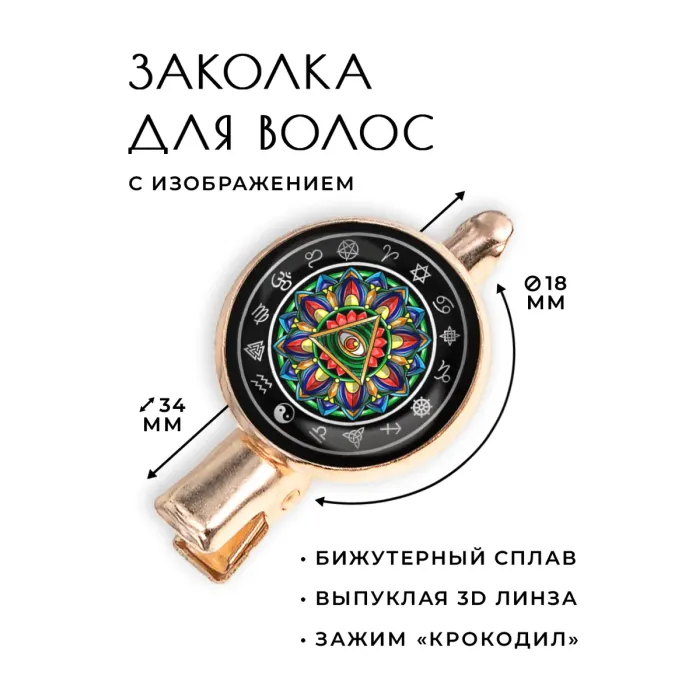 Размеры и комплектация: Размеры заколки: 34х20х15 мм. Диаметр изображения: 18 мм. Тип зажима: крокодил. Упаковка: прозрачный пакет.