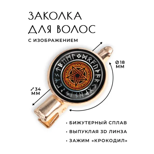Размеры и комплектация: Размер заколки: 34х20х15 мм, диаметр изображения — 18 мм. Тип зажима — «крокодил». Упаковка — прозрачный пакет.
