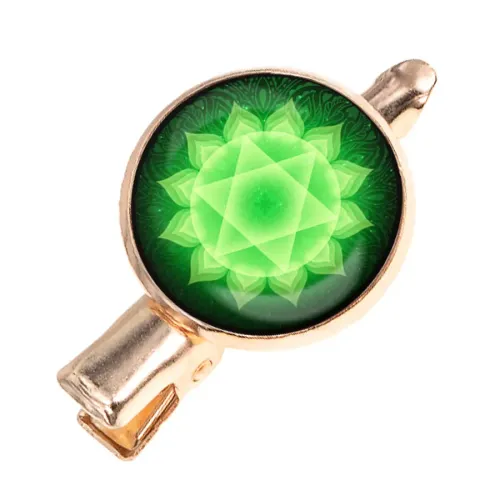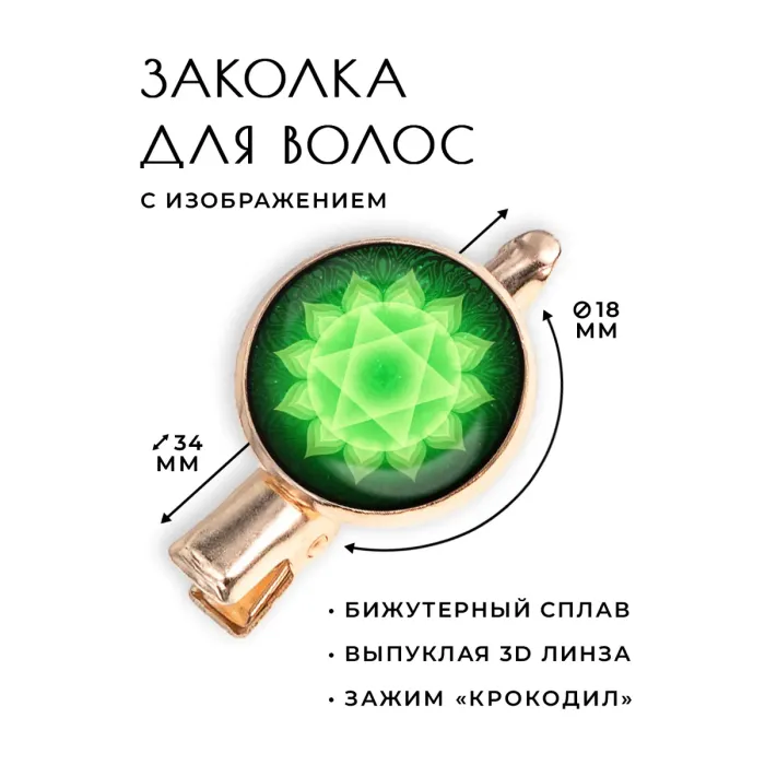 Заколка для волос из бижутерного сплава с покрытием под розовое золото и изображением чакры под стеклянной линзой.