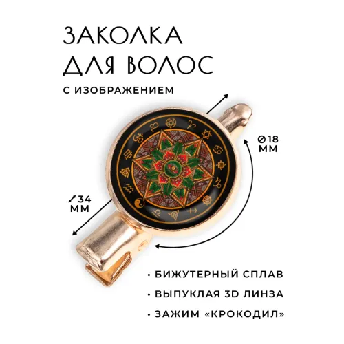 Размеры и комплектация: Размеры заколки: 34х20х15 см; диаметр изображения: 18 мм. Тип зажима: крокодил. Упаковка: прозрачный пакет.