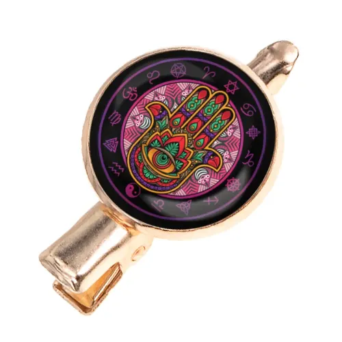 Заколка для волос в виде символа Хамса, изготовленная из бижутерного сплава с покрытием под розовое золото и стеклянной линзой.