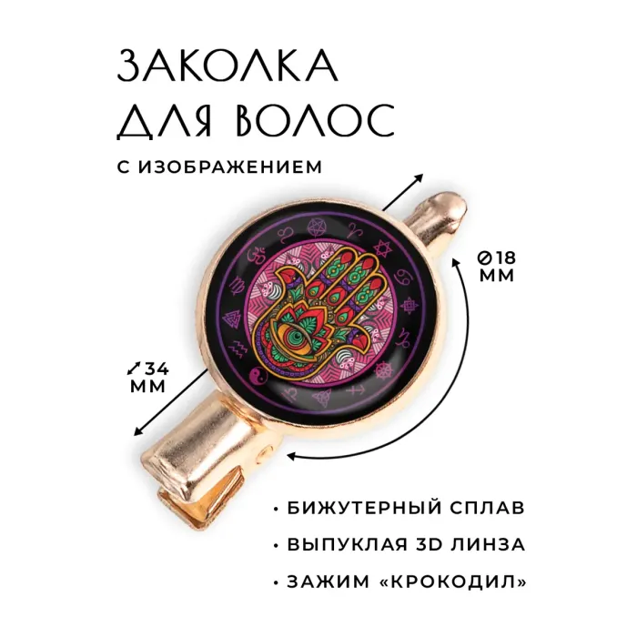 Размеры и комплектация: Размер заколки: 34х20х15 мм, диаметр изображения: 18 мм. Тип зажима: крокодил. Упаковка: прозрачный пакет.